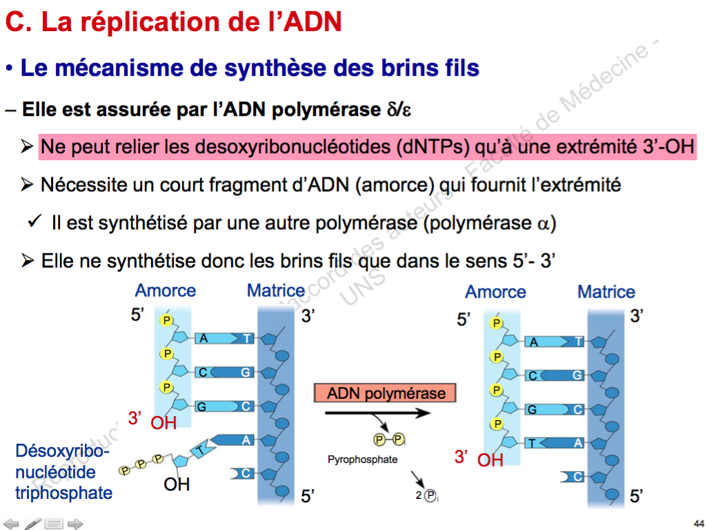 La synthèse des brins fils ne se fait que dans le sens 5' -> 3'. Donc les dNTPs doivent être incorporés à l'extrémité 3' (-OH) du brin fils pour respecter ce sens.
