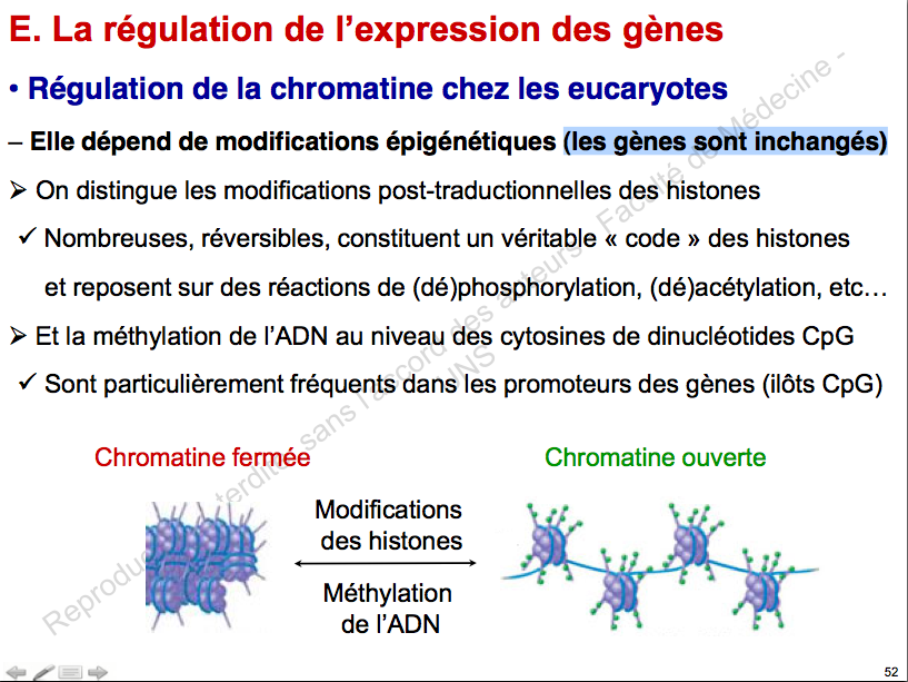 Par rapport à cet item "La régulation de la chromatine dépend des modifications épigénétiques : modifications post-traductionnelles des histones ou méthylation de l’ADN (favorisant la formation d’hétérochromatine et pouvant être transmise)".