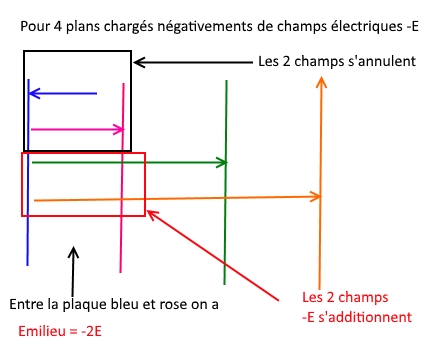 Ensuite si on a N plaques chargées positivement avec la même densité de charges électriques sur chaque plaque, en un point donné de l’espace (distinct des plaques) il faut considérer N champs électriques qui sont chacun répulsif par rapport à la plaque qui l'a créé.