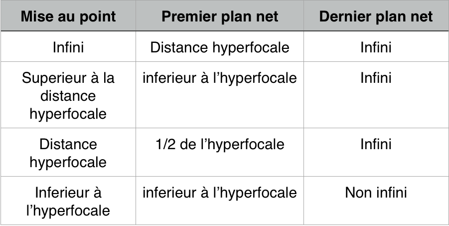 pipoudii a écrit:Distance hyperfocale est la distance séparant l’objet du premier plan net lorsqu’on fait la mise au point sur l’infini