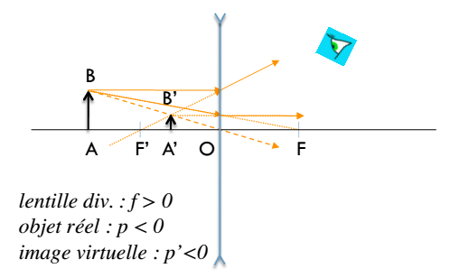 Or le fait est que nous avons une lentille divergente donc en conséquence le foyer image F' est à gauche, du côté de l'espace objet. Pourquoi alors les rayons lumineux ne convergeraient pas vers le foyer image ?