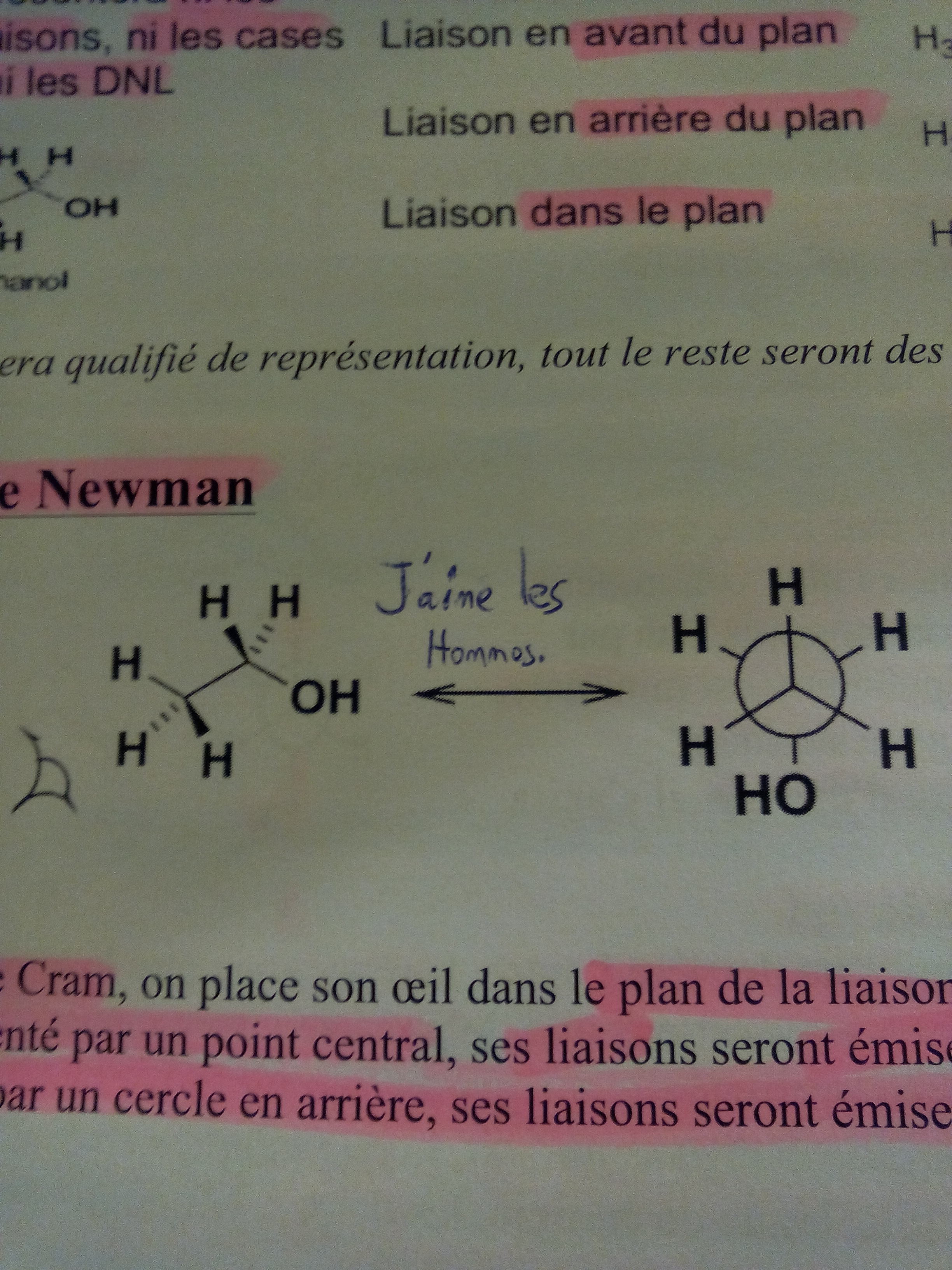 Bref venons en aux faits. Je me demande si on doit être capable de pouvoir déduire d'une projection de Newman, la représentation de Cram.. Je m'explique. Je suis devant l'exemples de la ronéo de l'an dernier avec l'éthanol, le premier carbone étant lié à 3 hydrogènes, un dans le plan, l'autre en avant et le dernier en arrière, pour le second carbone, l'alcool est dans le plan et les hydrogènes sont en avant et en arrière.