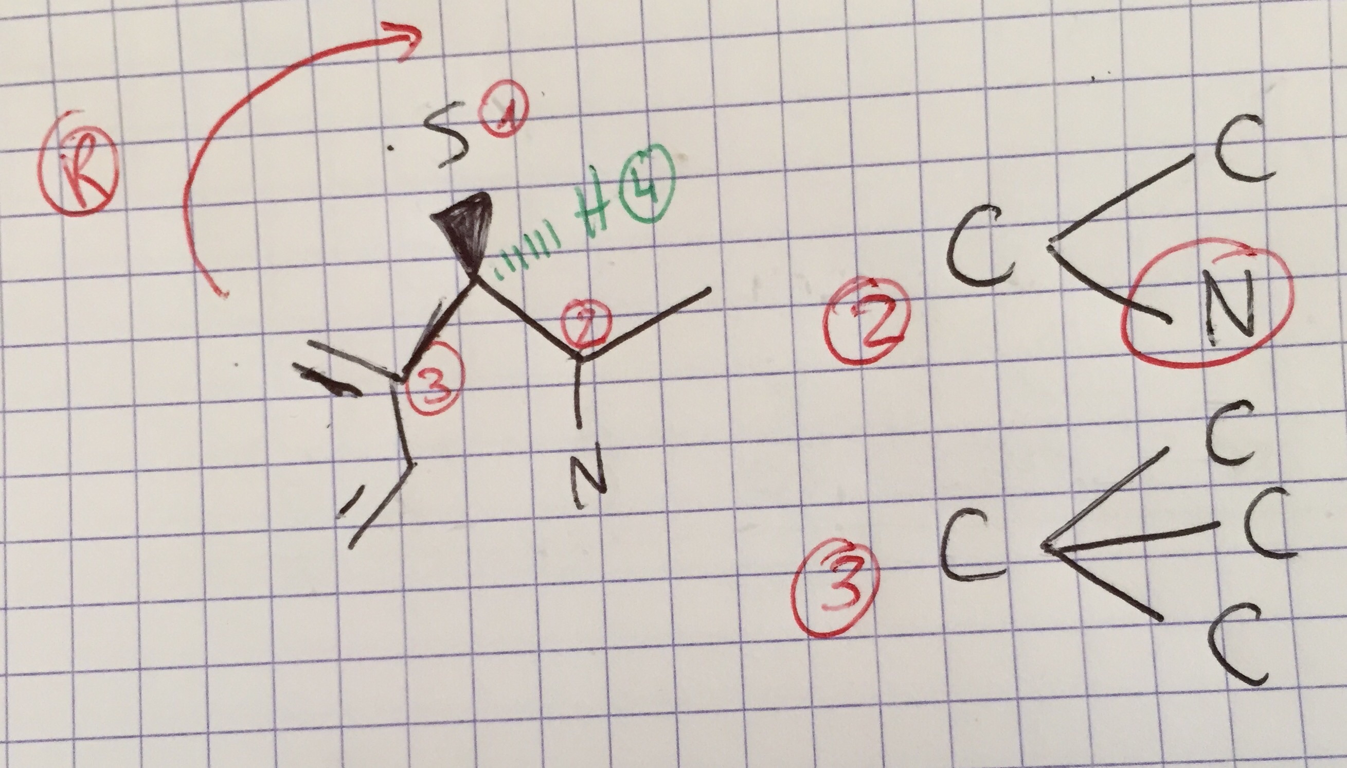On reprend : ton C* est lié à un souffre, 2 carbones, 1 H. Le H a le Z le plus petit , il est bien en arrière, parfait.