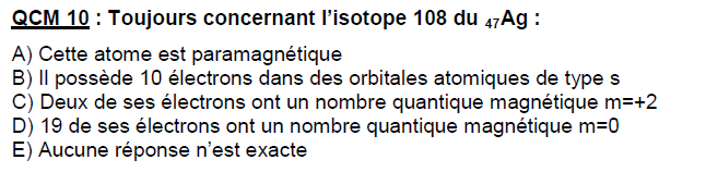QCM 9 : Concernant l’isotope 108 du 47Ag :