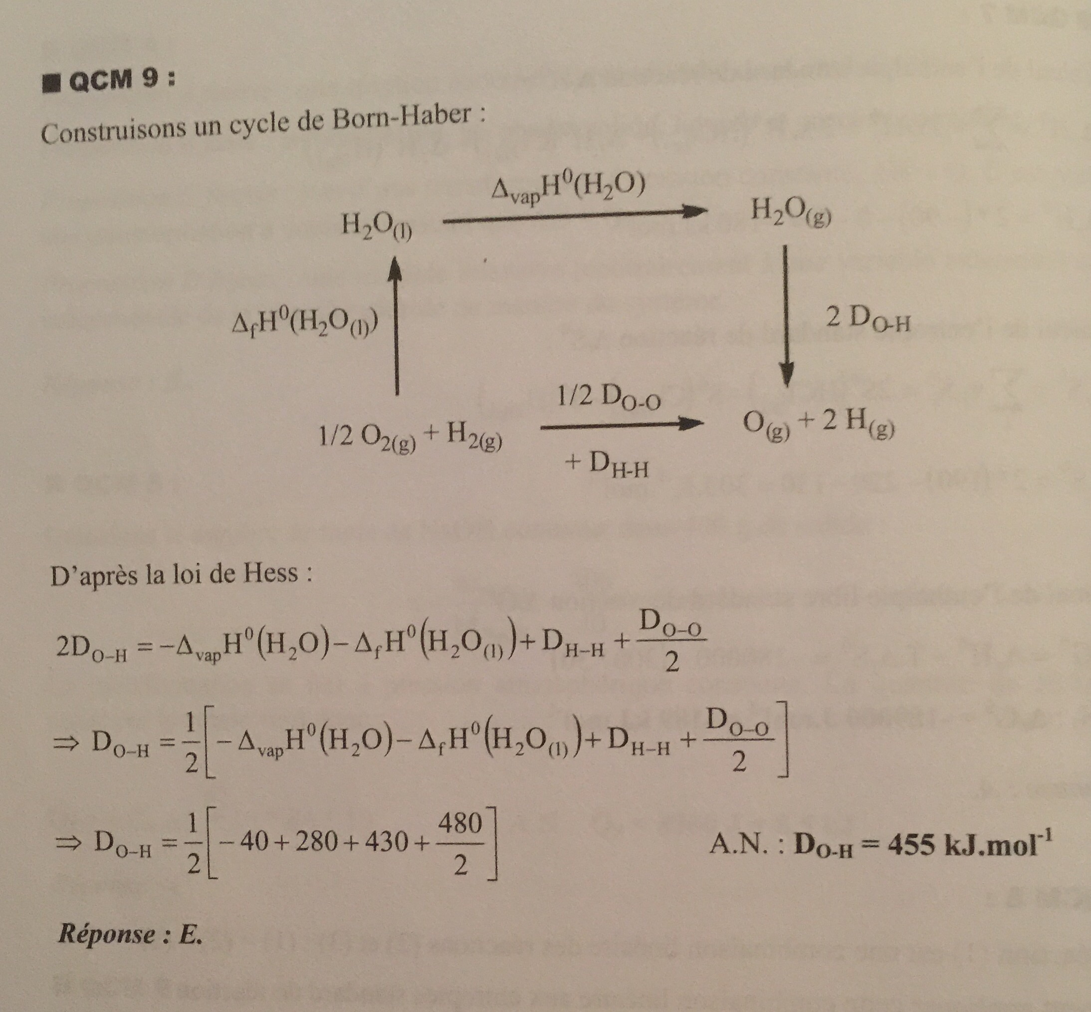 Ensuite tu formes tes liaisons O-H (énergie comptée négativement) pour former ta molécule d'H2O, ces énergie de liaison sont tes inconnues (je les ai notées