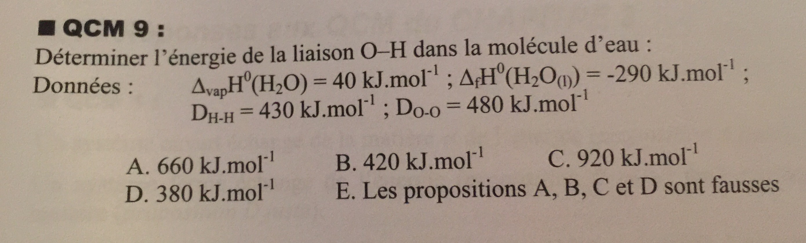 L'énergie de la liaison H-O vaut donc 460 kJ.mol-1
