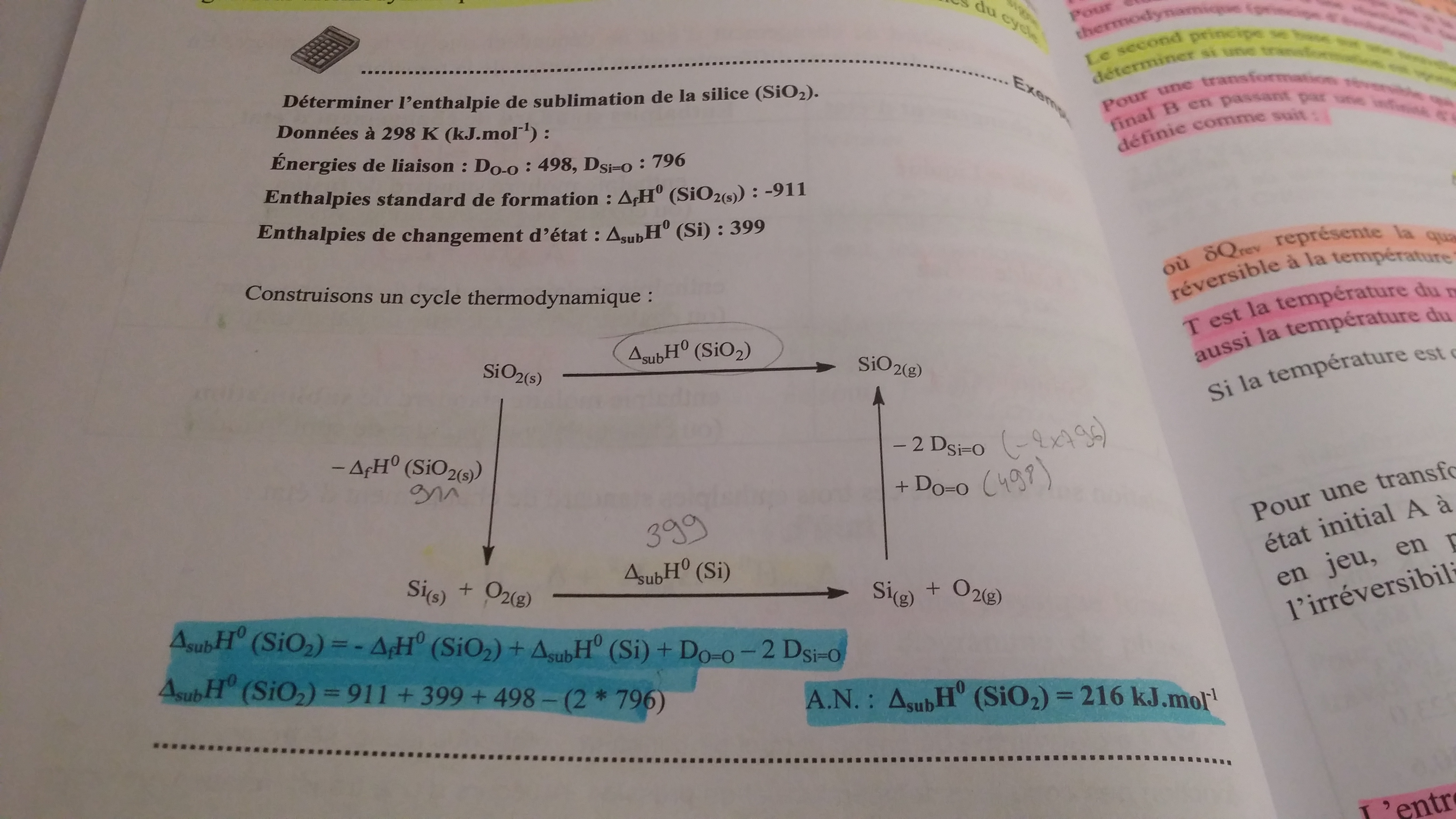 Après avoir refait l'exercice, je suis à 99,99% sure que l'on casse la liaison, en fait le but c'est de passer de Sio2solide à SiO2 gazeux. Donc tu vas faire ton cycle et en premier tu utilise l'enthalpie standard de formation de Si02 solide (+911Kj/mol) là tu obtient Si solide et O2 gazeux (c'est les corps purs simple) et en fait après avoir fait changé d'état à Si solide par la sublimation il devient gazeux, tu vas chercher à reformer du SIO2 gazeux mais pour cela (il faut dessiner la molécule) tu dois former 2 liaison