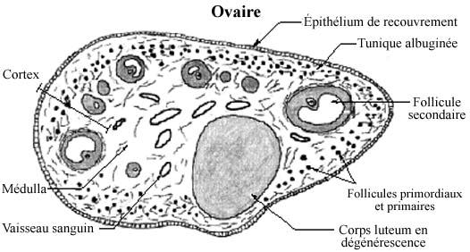 - le cortex qui est donc la partie periphérique et qui contient tous les follicules et corps jaunes, et l'épithélium germinatif qui est la couche la plus superficielle de l'ovaire