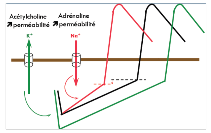 Dans le cas de l'adrénaline, ce coefficient directeur est modifié, ce qui a pour conséquence une dépolarisation nettement plus rapide (le potentiel seuil, lui même légèrement abaissé, est atteint plus rapidement). La pente est plus "abrupte" donc la dépolarisation est plus rapide :bashful: