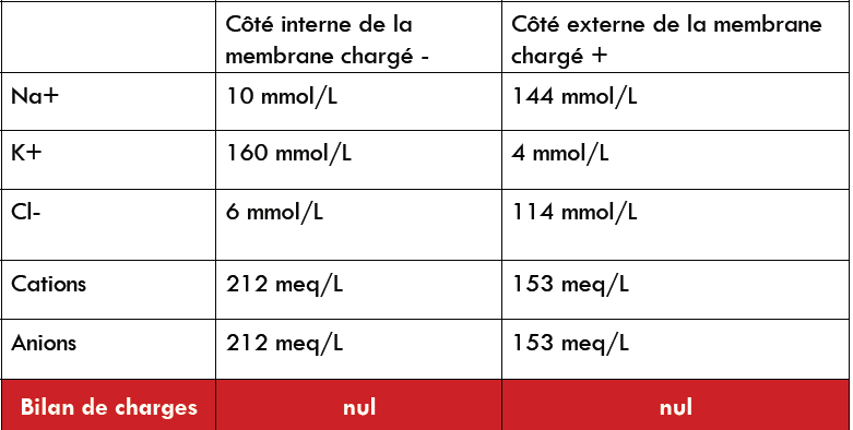 "Lisez bien le tableau parce qu'il vous explique dans quel sens les différents ions ont tendance à traverser (le Na+ entre dans la cellule, le K+ sort, le Cl- entre) selon le potentiel chimique. MAIS il faut prendre en compte le potentiel électrique".