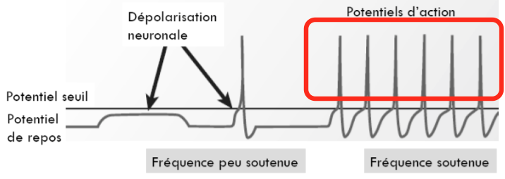 En fait, cette phrase sous-entend que le neurone va être excité pendant une longue période, il va subir de nombreux PA à une grande fréquence, ce qui fait que dans la globalité, le potentiel de membrane sera longtemps au dessus du potentiel seuil.