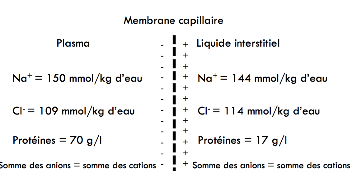 Alors, de manière globale, il n’y a pas de déséquilibre électrique (on considère que les milieux sont neutres électriquement), il n’y a que au contact de la membrane que l’on retrouve une petite différence de charge. Au niveau du plasma, tu as énormément de protéines chargées négativement, ce qui fait que la charge de ton plasma est lègerement inférieure à celle du milieu interstitiel. Cependant, ne te prend pas trop la tête avec tout ça, il faut seulement que tu retienne le mécanisme de l'effet Donnan et ses conséquences sur la composition des liquides.