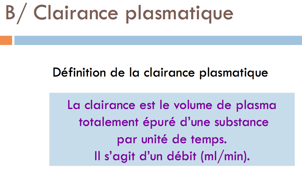 concernant cet item : A) La clairance plasmatique est le volume de plasma totalement épuré d’une substance par unité de temps