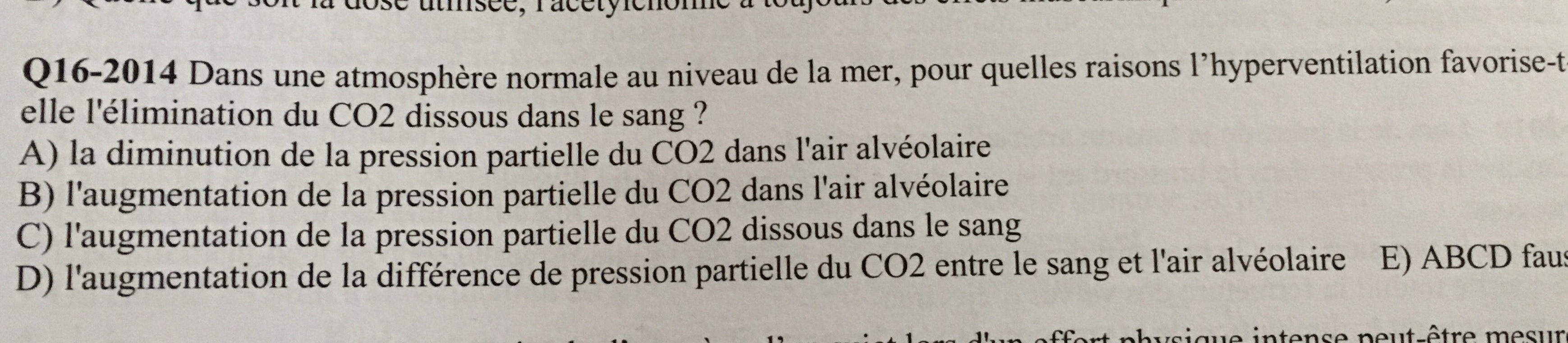 Coucou La D est fausse car quand tu hyperventiles, tu diminues grandement ta pression alvéolaire en CO2 et donc par conséquent tu épures ton sang du CO2 => Diminution de la pression partielle du CO2 dissout dans le sang !