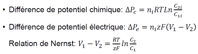 :arrow: D'après la relation de Nerst : le potentiel chimique équilibre le le potentiel électrique. Du coup potentiel chimique + potentiel électrique = 0. D'où :