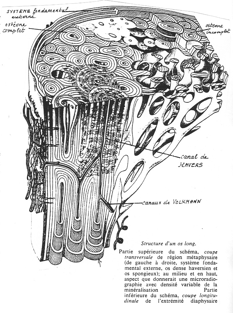 Alors c'est très simple en fait : Tu vas avoir ta moelle osseuse au centre de la diaphyse dans la cavité médullaire avec des reliquats d'os trabéculaire qui tapissent la corticale formé d'os compact. Dans un premier temps l'ostéoclaste traverse la corticale perpendiculairement à l'axe de la dipahyse avec formation d'un canal de volkmann puis suit des lignes de forces parallélles au canal médullaire pour former un canal de havers qui va être entouré de lamelles concentriques formant ainsi un ostéon (unité de base de l'os corticale secondaire = haversien). Tu vois le trajet clairement sur le schéma ci dessous : 1 - Volmann et 2 - Havers