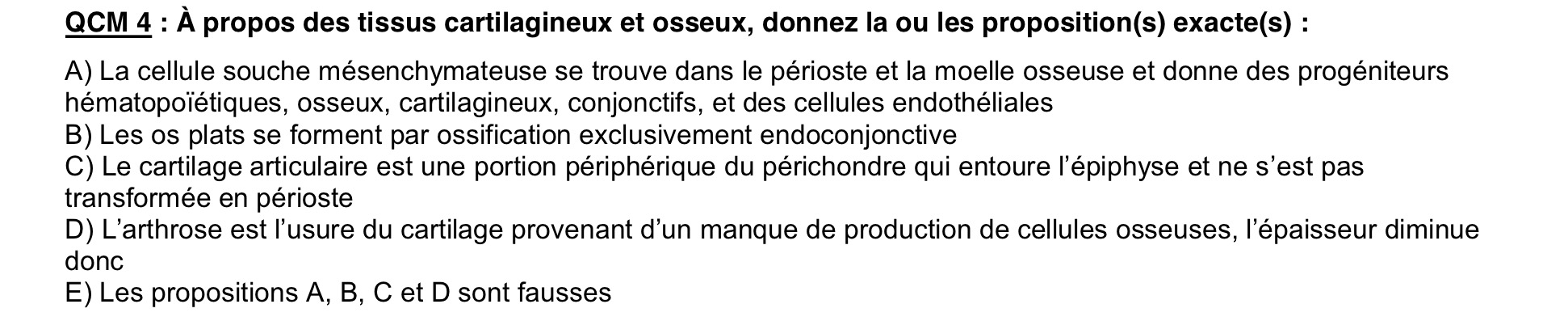"Seule la région articulaire, dépourvue de périchondre, reste cartilagineuse" : Cette phrase est vraie dans la mesure où le périchondre va peu à peu se transformer en périoste qui va permettre la synthèses de lamelles osseuses qui vont remplacer le cartilage d'origine. Ainsi seulement aux extrémités on aura une persistance de cartilage au niveau articulaire