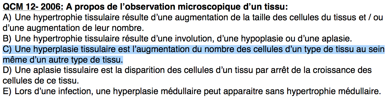 L'item C est compté FAUX car c'est la définition d'une hyperplasie CELLULAIRE