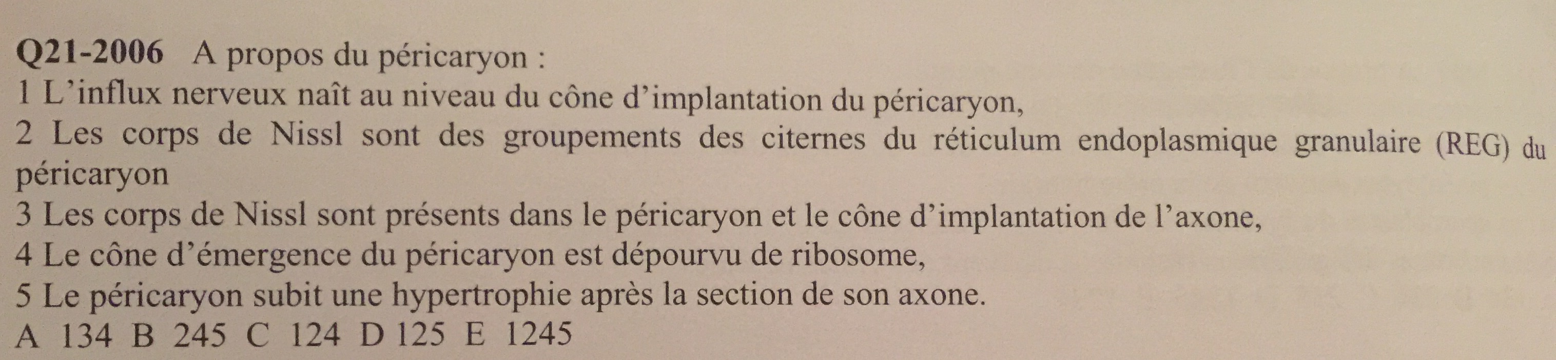 La 1 est fausse car c'est le cône d'implantation de l'axone, pas du péricaryon ;)