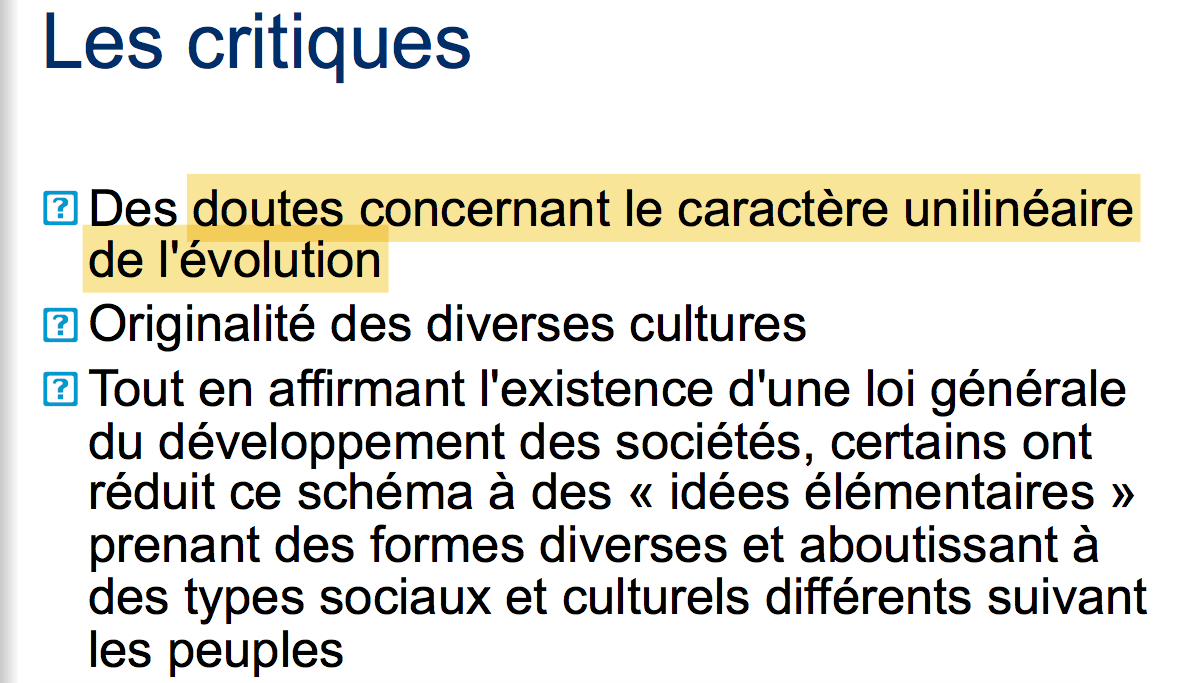 mais la question du qcm est bizarre parce qu'on parle d'évolutionnisme unilinéaire alors que dans le diapo on parle du caractère évolution unilinéaire, alors faut il distinguer les deux ?