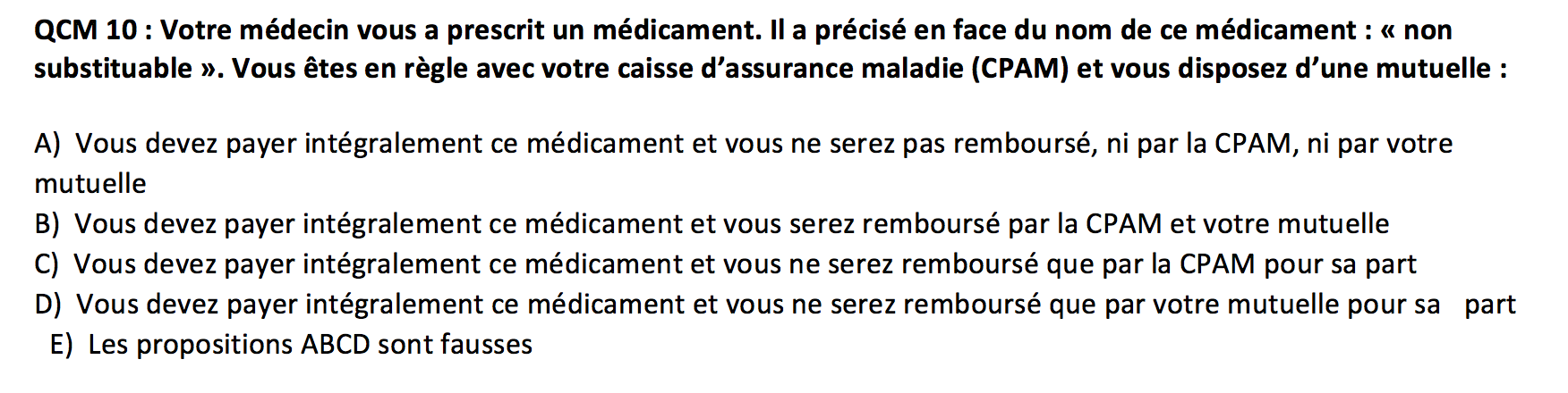 dans ce QCM, la réponse B est donnée juste, mais on a vu à la SDR avec Drici que si c'était marqué en toutes lettres "non substituable", le patient ne perdait pas le tire-payant, donc ne devait pas payer.