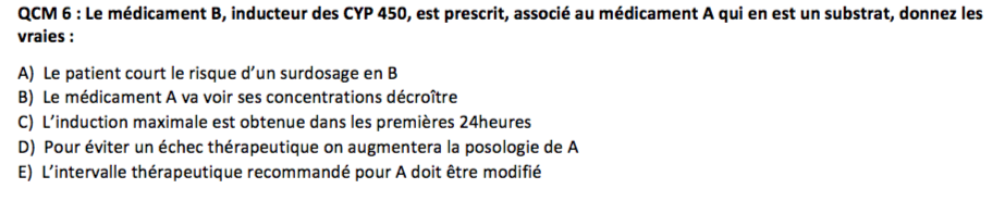 En fait je comprends pas surtout le dernier item, comme on dit qu'on doit augmenter les doses pour avoir le même effet en présence de l'inducteur B, forcémment il faudra augmenter la dose pour laquelle le médicament est efficace, du coup l'index thérapeutique se décalerait vers le haut? Je sais pas si c'est très clair...