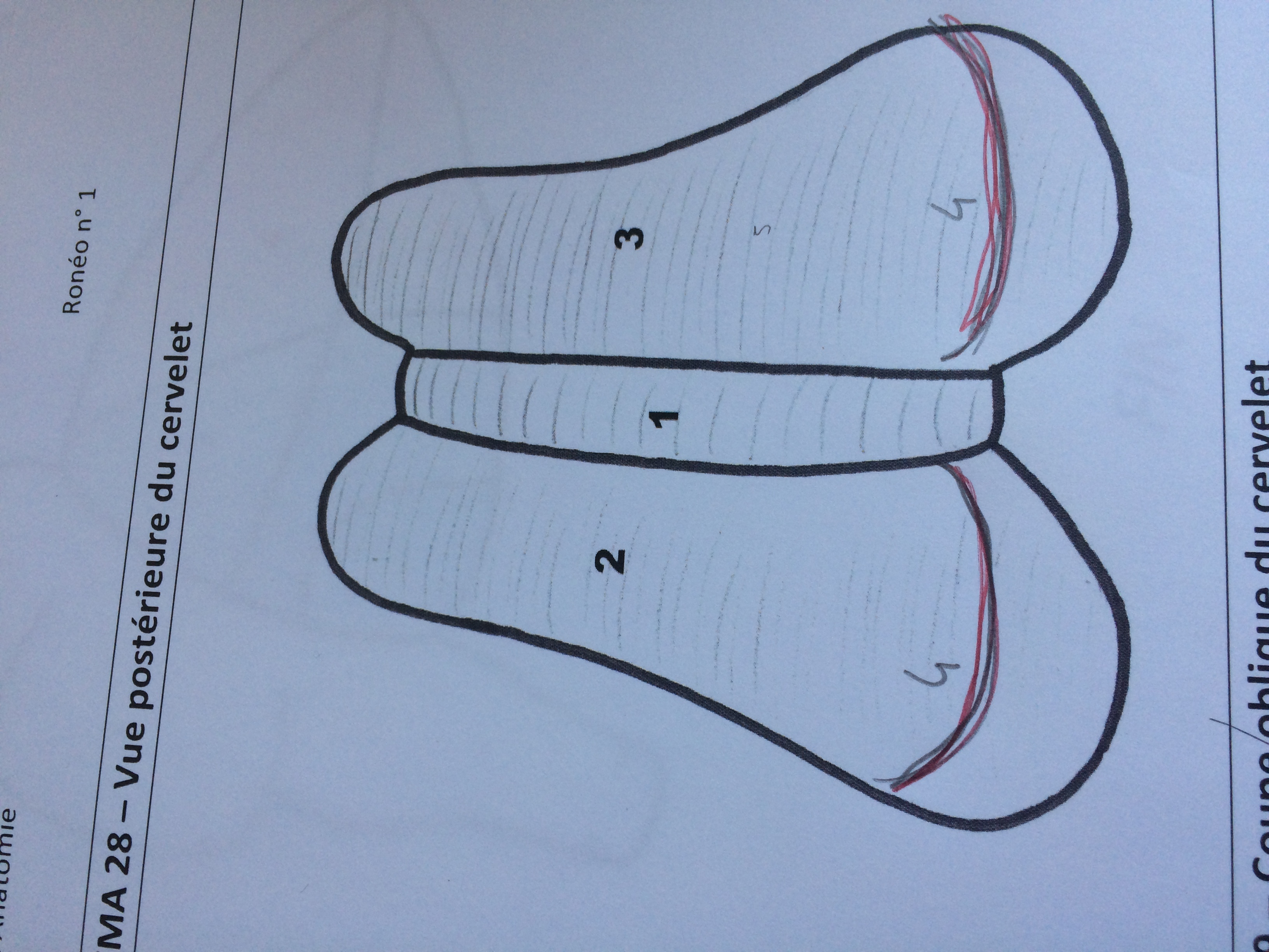 Sur une vue postérieur du cervelet, le prof a dessiné 2 fissures (en rouge sur ce schéma) les a qualifiés de grande fissure horizontale du cervelet