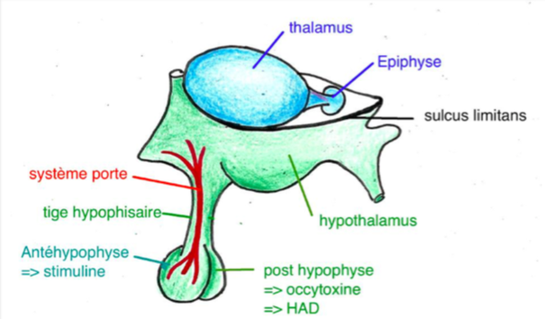 Dans la ronéo 2 page 4, on nous dit : "Hypothalamus (sous le thalamus) = centre végétatif, séparé par le sulcus sulcus limitans du thalamus"