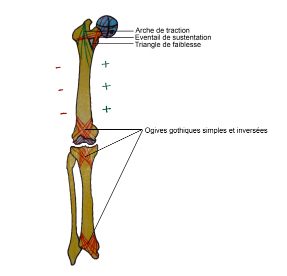 je visualise pas comment s'organisent les pressions au niveau du fémur (ogives spongieuses, ogive gothique inversée..)