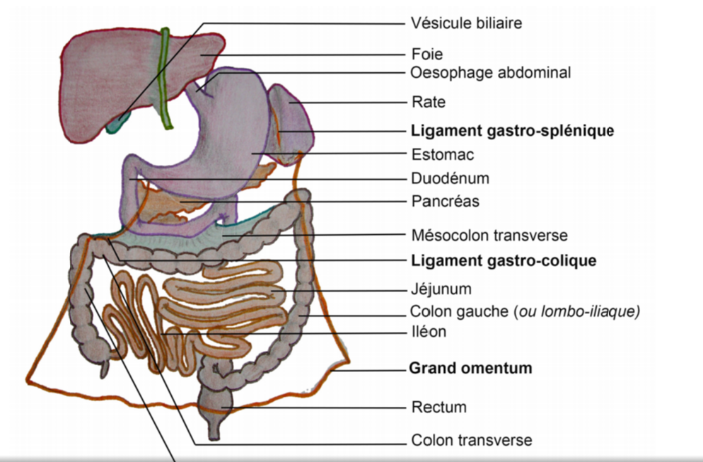 Je ne comprends pas pourquoi il est dit dans la ronéo que le grand omentum "recouvre l'ensemble des viscères sous-mésocoliques", ce n'est pas plutôt supra mésocolique ? Car sous mésocolique c'est sous le mésocolon transverse..