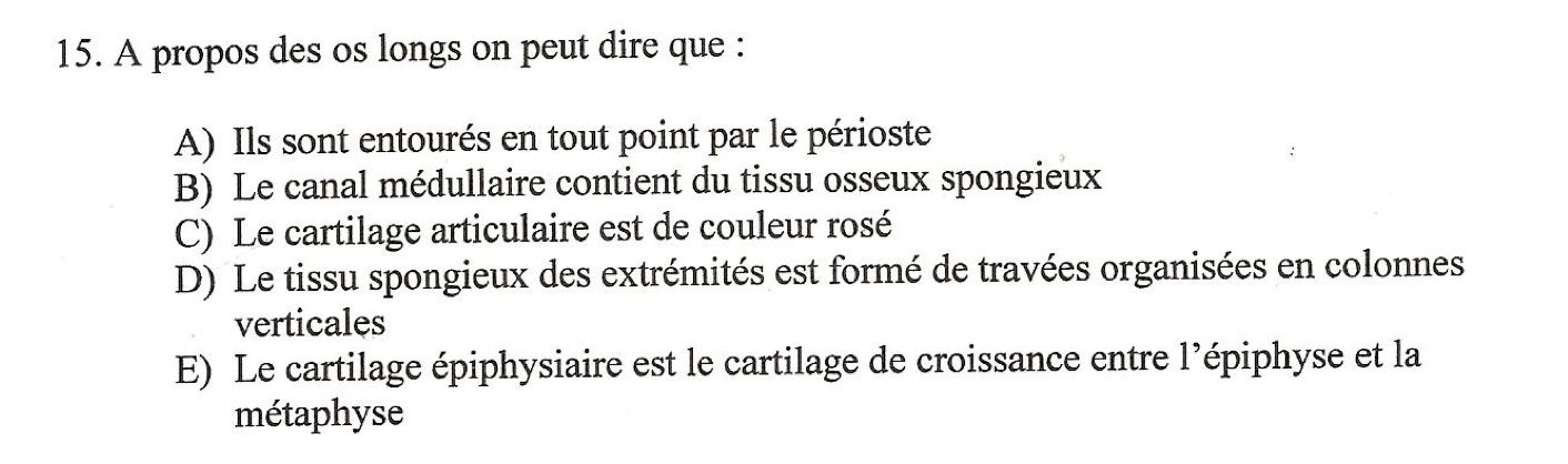 Les item D et E me posent pb. Je me souviens d'avoir vu un post comme quoi l'item E était Faux car c'est entre epiphyse et diaphyse, mais ce qui me dérange c'est compté la D vrai ... il ne s'agit pas plutôt d'ogive gothique (simple dans l'extrémité sup et inversée dans l'extrémité inf) ? Sinon, aucun item était juste c'est vraiment bizarre...