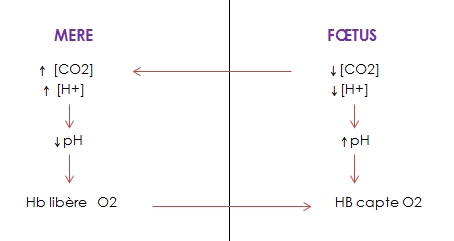 Chez la mère, On va avoir une augmentation du CO2 ( Qui provient du foetus), et une augmentation de H+, ce qui va entraîner une baisse du pH. Cette baisse de pH va donc baisser l'affinité de l'hémoglobine pour l'O2 et donc libération d'O2 ! (J'espère que je ne t'ai pas perdu !)