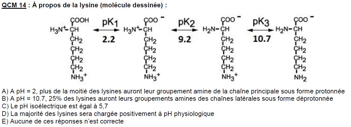 On nous donne la molécule de Glycine avec pkA pk2 pk3 etc.. et un item nous dit : "A pH=10.7, 25% des lysines auront leurs groupements amines des chaines latérales sous forme déprotonnés.." Cet item est compté juste.. Mais pourquoi 25% ? L'item est vrai si il y avait marqué 50% ..Est-ce possible 25 % ? Errata ?