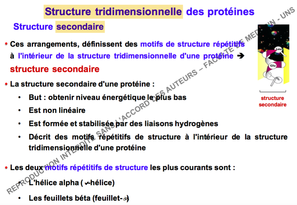 la structure tridimensionnelle s’acquiert lorsque la protéine a une organisation dans l'espace qui n'est plus linéaire, donc quand elle passe sous forme secondaire, si je comprend bien ? sauf que dans la ronéo (2) c'est marqué que "structure tridimensionnelle est synonyme de fonction biologique", alors que la fonction biologique s’acquiert a la structure tertiaire, non ?