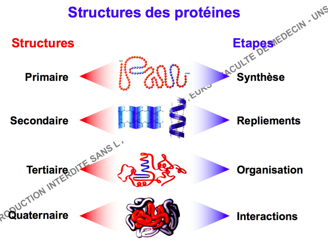Chaque protéine possède une structure primaire, secondaire, tertiaire --> la tertiaire donne la fonction de la protéine