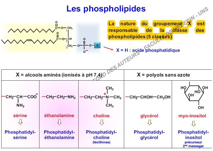 - Ensuite dans le QCM 13 Item B "les phospholipides sont classés par rapport au groupement X..."
