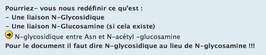Moi aussi j'ai N-glucosamine dans la ronéo 3 p3 de l'an dernier, et la liaison N-glycosidique dans la ronéo de cette année au niveau des glycoprotéine, alors que normalement il s'agit de la liaison pour les monosaccharides qui réagissent avec les amines
