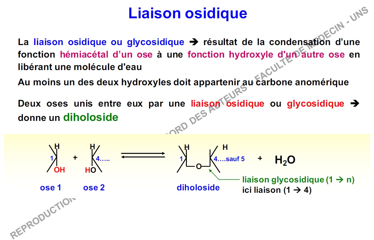 - La liaison osidique se fait entre l'hydroxyle d'un ose et la fonction hémiacétal d'un autre ose (=fonction comportant le carbone anomérique, son hydrogène et son hydroxyle) :arrow: une molécule d'eau sera libérée, donc oui le H du carbone anomérique est perdu