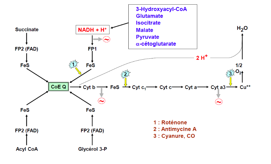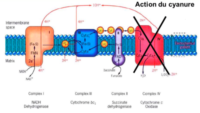 Quand un complexe est inhibé, on "casse" l'enchainement du transfert des électrons à un certain niveau.