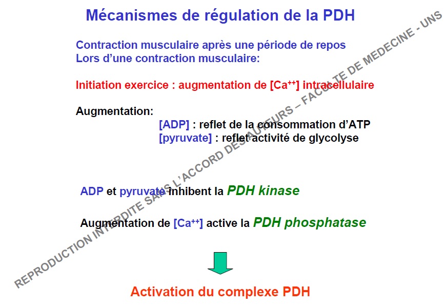 - le Pyruvate et l'ADP inhibent la PDH kinase / le Ca2+ favorise la PDH phosphatase :arrow: Activation complexe PDH