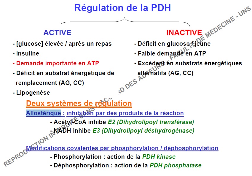 - le NADH, l'Acétyl CoA et la concentration d'ATP favorise la PDH Kinase :arrow: Inhibition complexe PDH