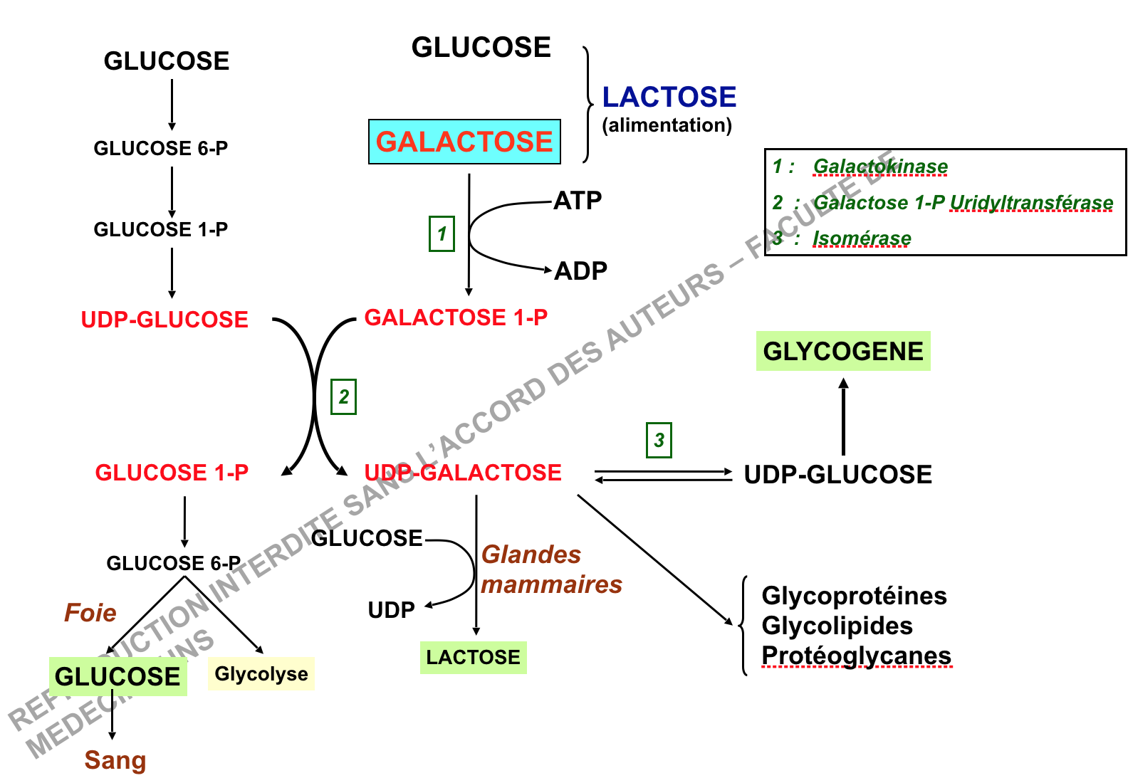 On voit que le galactose peut devenir du galactose-1-P (galactokinase), puis de l'UDP-Galactose (par le galactose 1 P uridyltransférase), je crois que la réaction exactement c'est : galactose 1 P + UDP-glucose :arrow: UDP-galactose + glucose-1-P