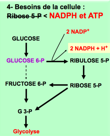 Si on a un besoin de NADPH --> une fois arrivée au Ribose 5P la voie des PP s’auto entretient car les intermédiaires de la glycolyse créée vont retourner dans la voie des PP pour continuer à produire du NADPH (via la 1ère réaction).