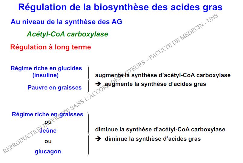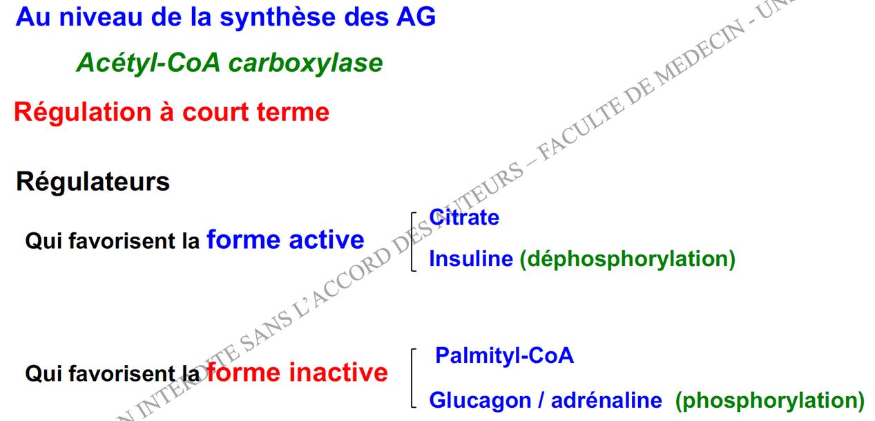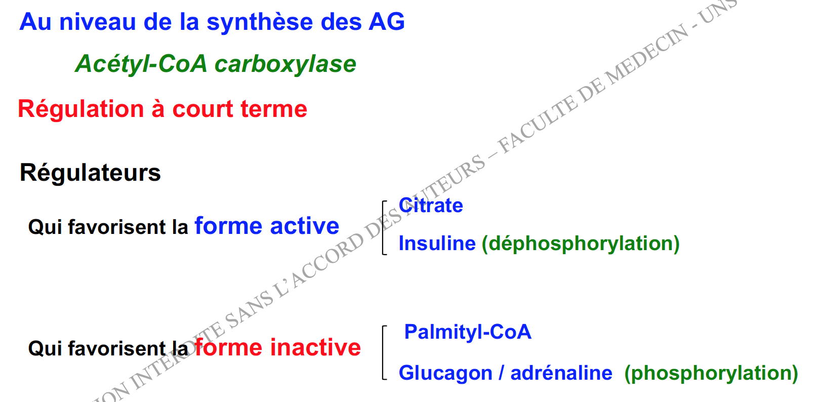 Dans le diapo ci-dessous, on voit que l'ACC est régulée, à court terme, par l'insuline et le glucagon/adrénaline par mécanisme de phosphorylation/déphosphorylation (en plus du citrate et du palmitylcoa, bref)