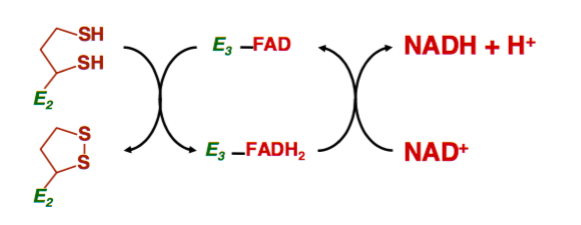 "Acide lipoïque réoxydé par réduction du FAD" puis "FAD réoxydé par réduction NAD+"