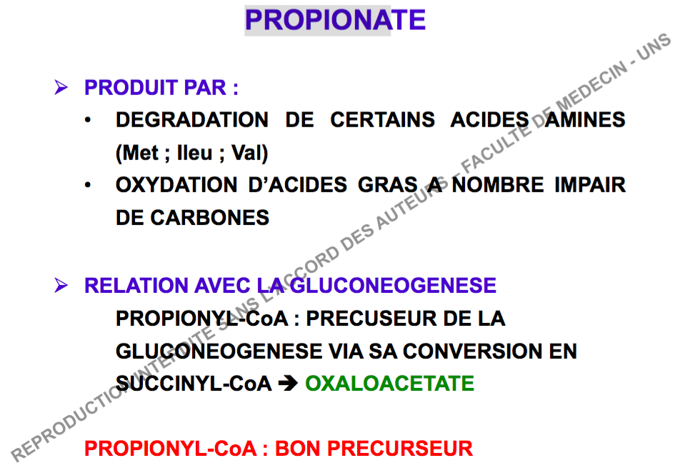 Dans mon cours j'ai aussi "le propionate est également le produit de dégradation de certains AA (M,I,V)"