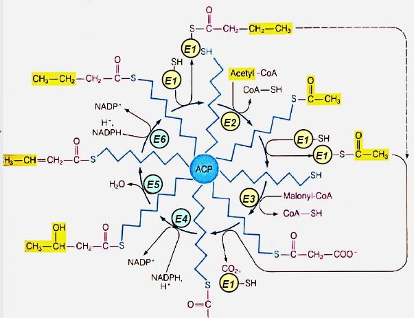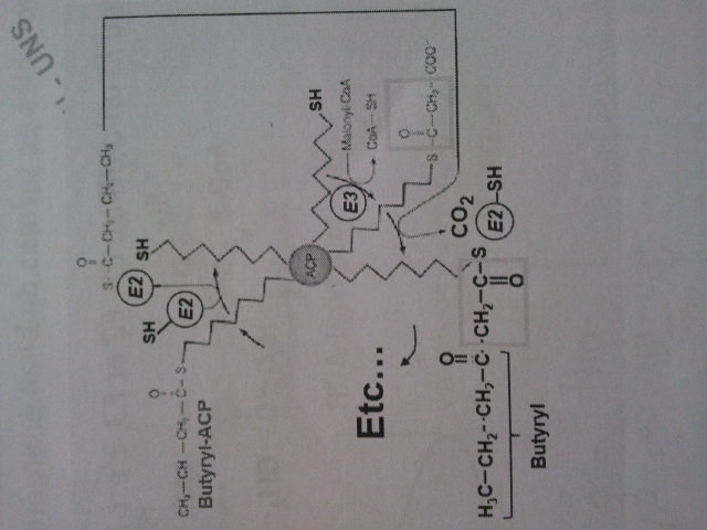 Pourtant, lors de l'élongation, on peut voir sur le schéma que c'est E2 qui va garder l'acyl (il va faire la nounou quoi ^^) pendant que l'ACP va chercher un nouveau malonyl coA, et c'est E2 qui permet la condensation des 2 (toujours d'après le schéma).