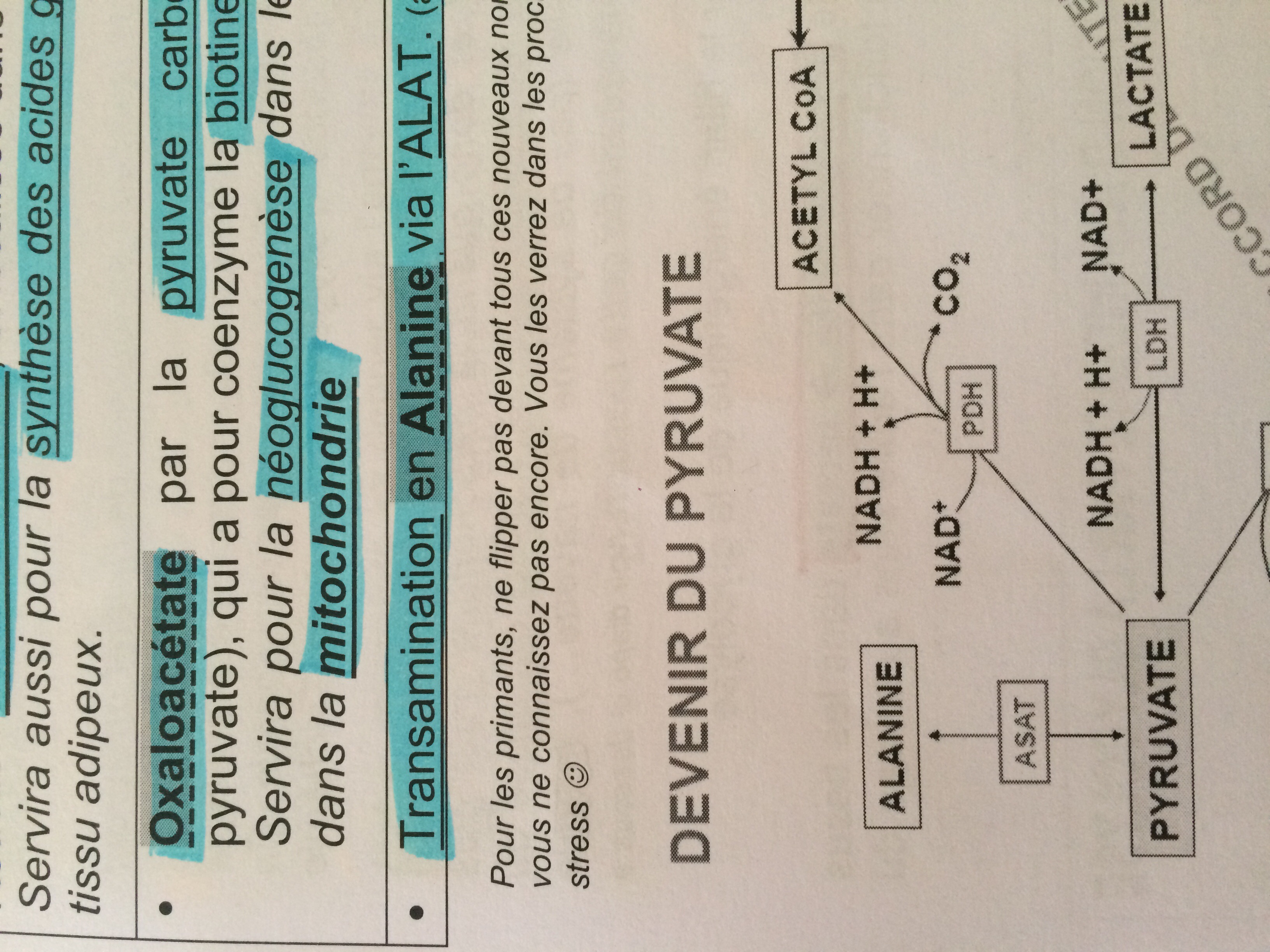 J'ai un petit pb sur la page 18 de La ronéo 9, sur La diapo de la prof, c'est écrit que le pyruvate donne de l'Alanine par L'ASAT...