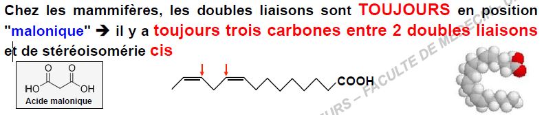 D) S’il y a plusieurs insaturations sur un acide gras, elles seront le plus souvent de configuration CIS et toujours en position malonique