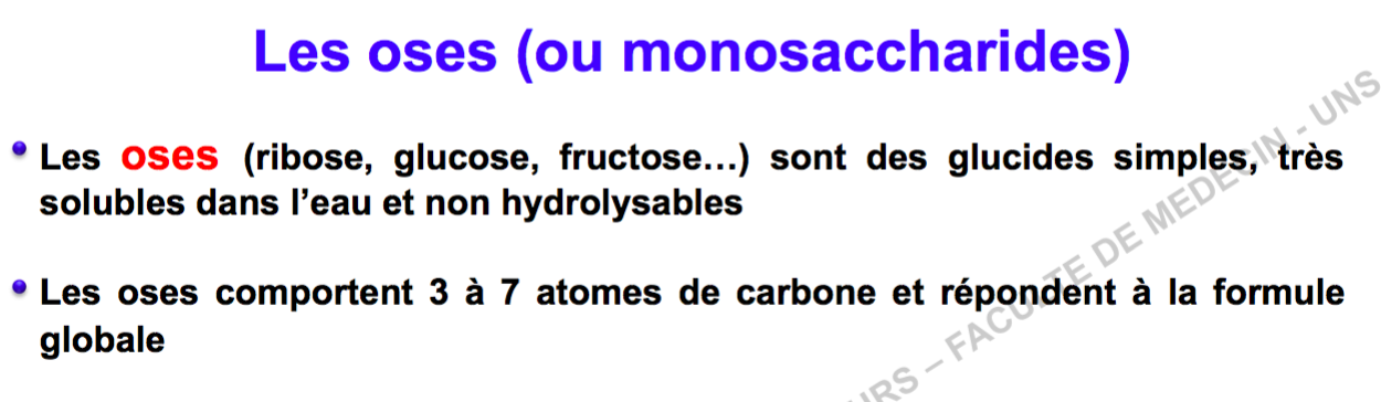 Item : "Les oses ou monosaccharides sont des glucides simple non solubles dans l’eau et non hydrolysables"
